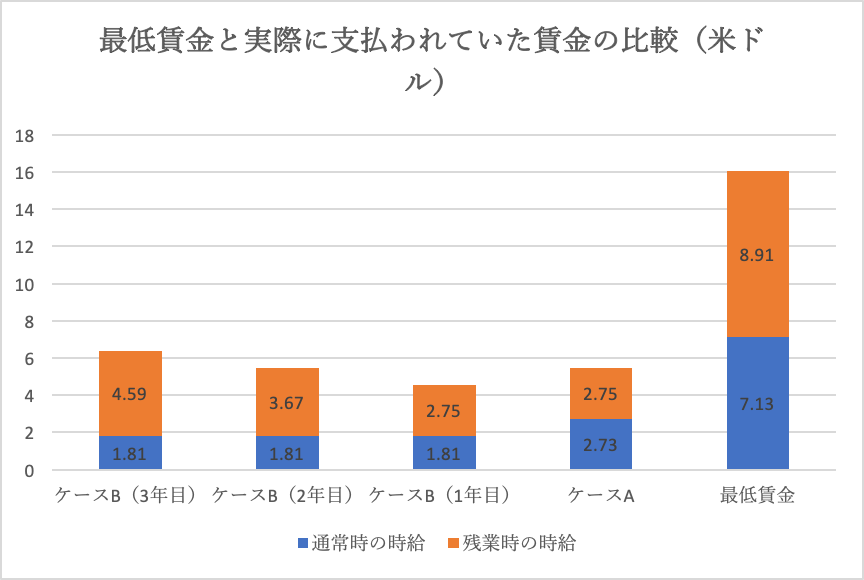 家賃と食費が引かれる前の月給は60,000円 (約551米ドル)で、それらが控除された手取りは月24,000円 (約220米ドル) だった。普段は朝8時30分から仕事がはじまり、12時に昼食休憩があった。しかしながら、注文が多い際は昼食休憩が20分とされた。昼食後は夕方5時30分まで働き、夕食休憩があった。忙しくない際は、3時に10分間の休憩が与えられた。夕食休憩は、冒頭で紹介したメイと同じく、30分しか与えられなかった。そして、6時半[MI1] から更に残業を行った。注文の量によって変化するが、夜11時や深夜1時まで働くこともあった。技能実習生だけ、遅いときには朝3時まで働かせられた。残業代は1年目が時給300円、2年目が時給400円、3年目が時給500円とされた。